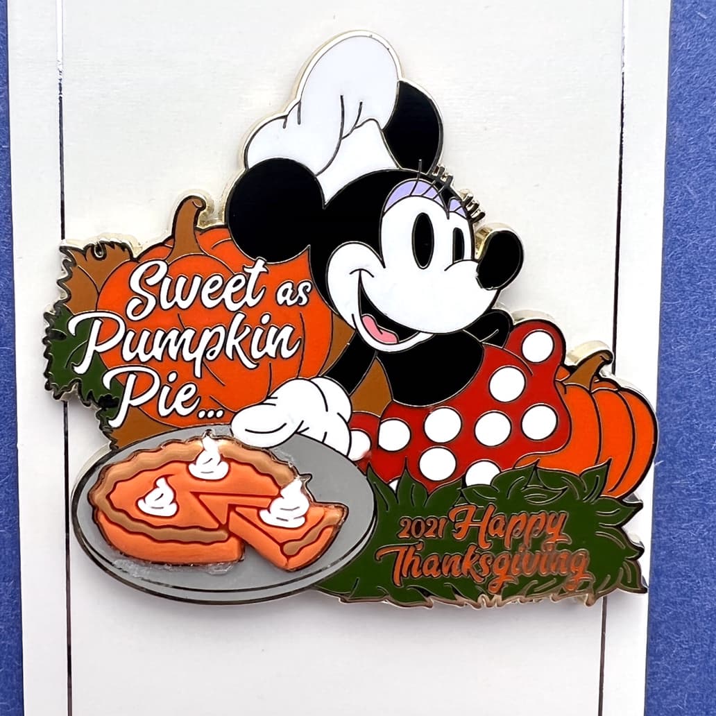 This limited release pin features Chef Minnie celebrating Thanksgiving. Minnie Mouse is holding a plate of Pumpkin pie. The pumpkin behind her says ''Sweet as Pumpkin Pie” in white letters. At the bottom it says "2021 Happy Thanksgiving" in orange writing. The back has two prongs with the mickey head waffle pattern.